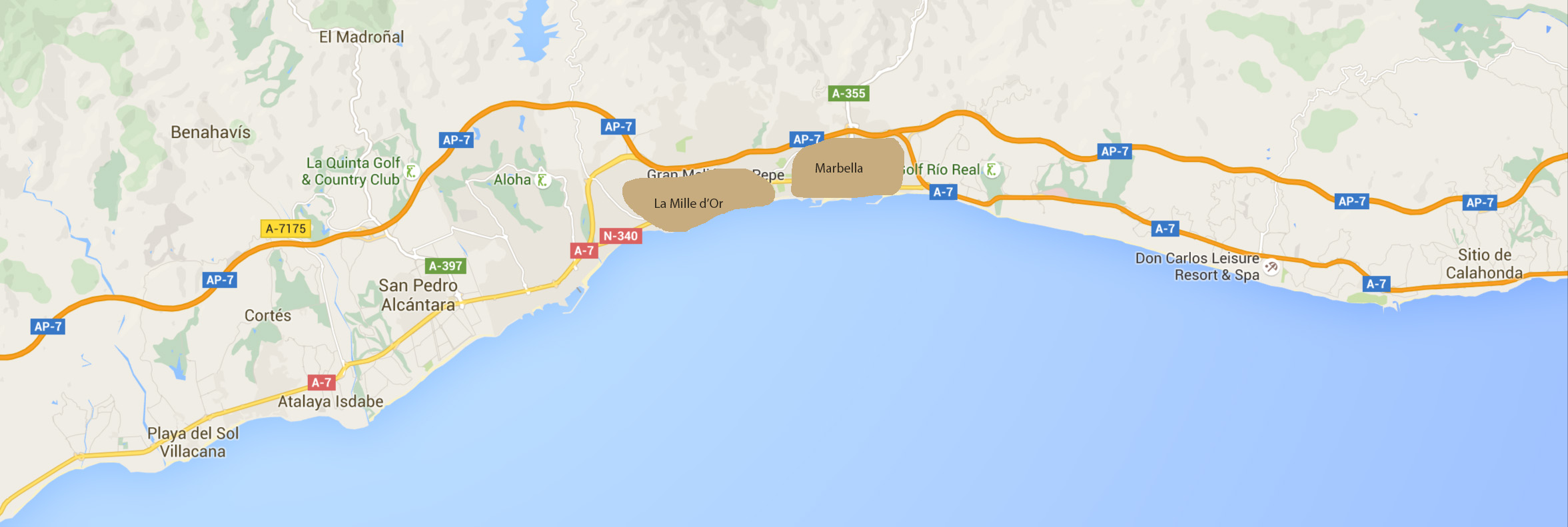 La Mille d'Or de Marbella est tout simplement synonyme de luxe, d'exclusivité et de glamour. L'Avenida Principe Alfonso de Hohenlohe, selon son nom authentique, s'étend du Piruli, l'obélisque de cuivre en bordure ouest du véritable centre ville, jusqu'à Puerto Banús. Le long de cette avenue bordée de palmiers et de jardins exotiques s'élèvent les hôtels les plus légendaires de la ville, tels le Club Hôtel Marbella ou le Puente Romano avec son Club de tennis très connu. Du côté de la montagne se trouvent le Palais du roi saoudien Fadh, construit sur le modèle de la Maison Blanche, ainsi que la mosquée juive. Les plages merveilleusement entretenues attirent par leurs beachclubs tels que le Trocadero ou le Suite del Mar de nombreux comédiens, chanteurs et autres personnalités importantes, que l'on retrouve la nuit dans les discothèques et boîtes de nuit des environs. D'impressionnantes villas et d'élégants immeubles d'appartements et de penthouses des plus luxueux s'élèvent quasiment tout au long de la promenade en bord de mer, de Meliá Don Pepe à Puerto Banús.Tout en étant très exclusive, la Mille d'Or, présente aussi des supermarchés et des restaurants de premier choix, ainsi que de nombreuses galeries d'art. Alhambra del Mar, La Alcazaba, Las Torres, Marbellamar, Marina Marbella, Oasis et Rio Verde font partie des urbanisations situées près de la mer.