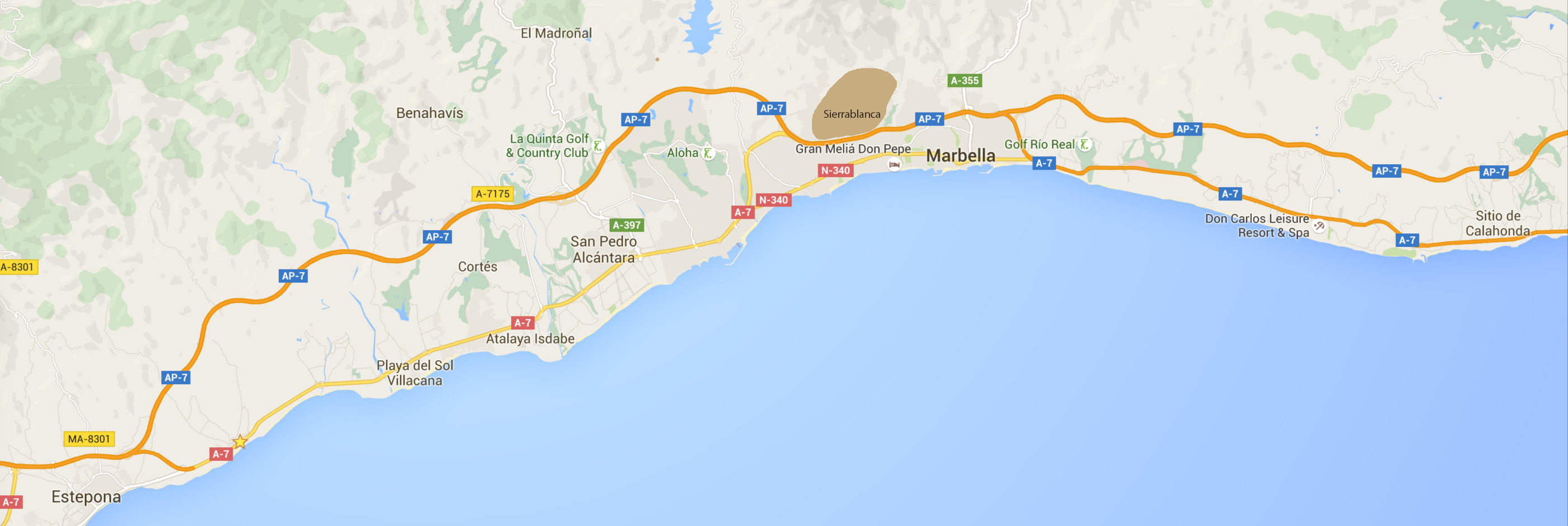 Sierra Blanca jouxte à l'est à une urbanisation de taille nettement plus petite, quoique tout aussi luxueuse, du nom de Cascada de Camoján et au sud à la Buchinger-Klinik, de renommée mondiale. Vous n'êtes qu'à quelques mètres du prochain terrain de golf et vous pouvez vous rendre au centre ville de Marbella, à la Mille d'Or avec ses plages bien entretenues ou à Puerto Banús en seulement cinq minutes avec votre voiture.